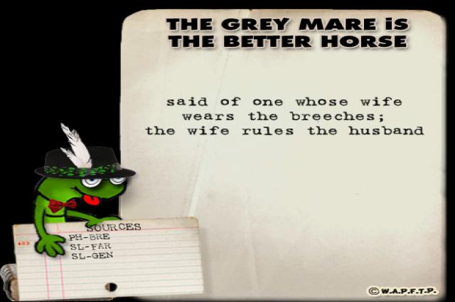 The grey mare is the better horse. 【误译】灰色母马是更好的马。 【正确】妻子胜过丈夫。 说明:The grey mare is the better horse是谚语,意为“妻子胜过丈夫”。